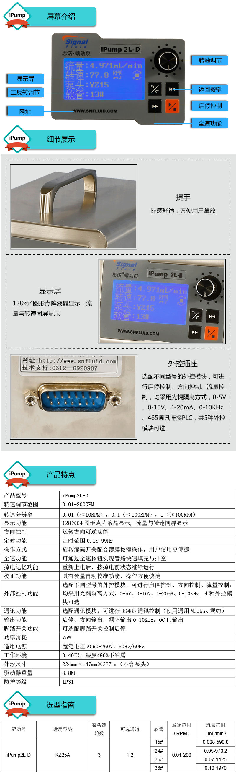 ? ? ?1.流量范圍:0.028-1970mL/min ? ? ?2.獨有的定時功能,定時定量添加,使用更便捷 ? ? ?3.大扭矩,適合多泵頭串聯使用 ? ? ?4.流量與轉速同屏顯示,流量校正 ? ? ?5.流量精度高達±0.5%以內 ? ? ?6.304不銹鋼外殼,易擦拭,耐腐蝕 ? ? ?7.采用進口電機驅動芯片,性能好 ? ? ?8.線路板全部三防漆處理,防腐、防潮