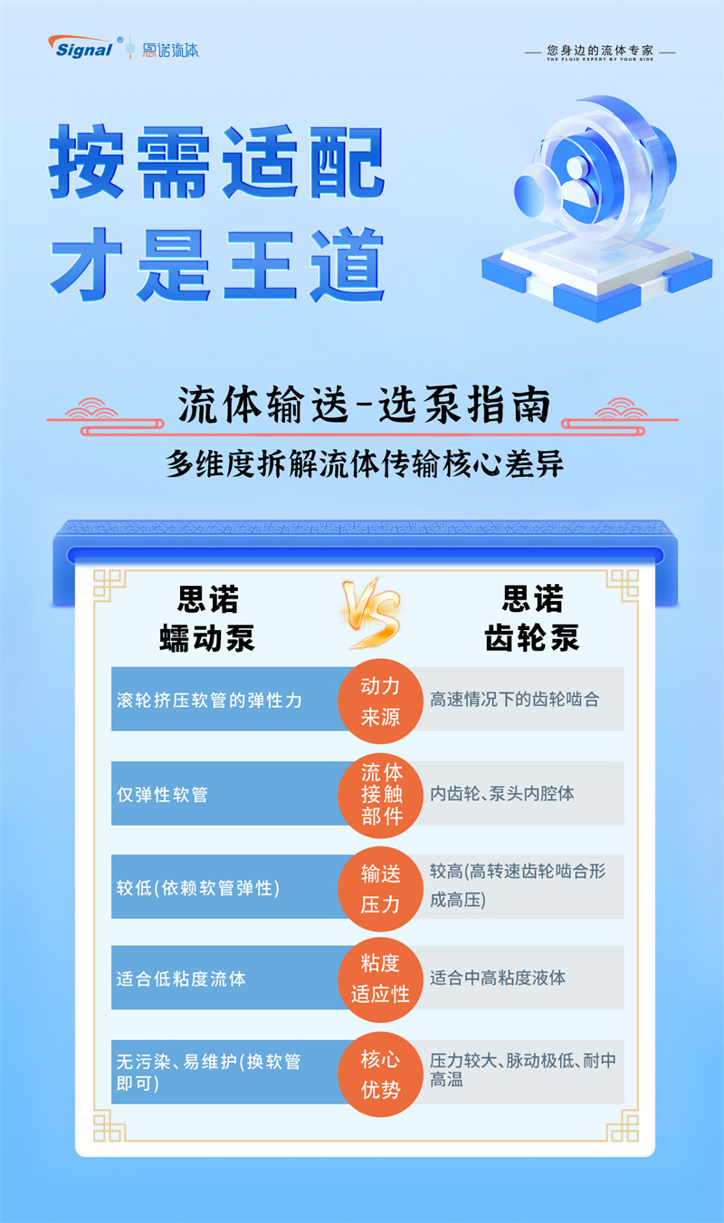 按需適配,方為選型王道。蠕動泵和齒輪泵各有千秋。蠕動泵輸送溫和、無污染、易清潔且能處理含固體顆粒流體,尤其適合衛(wèi)生、腐蝕性或剪切敏感介質(zhì)。齒輪泵則結(jié)構(gòu)緊湊、輸出壓力高、流量穩(wěn)定且效率高,適合高粘度流體和高壓需求。兩者并無絕對優(yōu)劣,關(guān)鍵在于根據(jù)具體應(yīng)用需求(如介質(zhì)特性、壓力、流量、衛(wèi)生等級、預算)進行精準適配。