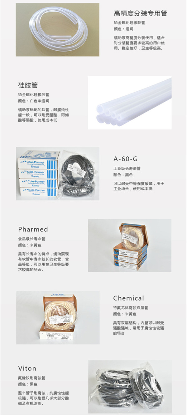 顏色白色半透明,蠕動(dòng)泵標(biāo)配的軟管,耐腐蝕性一般,可以耐受醋酸,丙烯酸等弱酸,使用成本低,被廣泛使用,食品分裝行業(yè)。