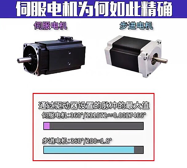 伺服和步進所指電機部分,伺服電機和步進電機一樣都是電機走一圈,脈沖數越大每一步的角度就越小精度就越高,而伺服電機軸后端如果是17位編碼器的話,那么驅動器每接收131072個脈沖信號電機才轉一圈,也就是它走一下,僅移動了0.0027°,那么它步進角為1.8°步進電機的655倍,而大部分步進電機只能設置到25000個脈沖, 所以說伺服電機的精度是步進電機,同時伺服電機是閉環控制,有效的反饋也了電機。