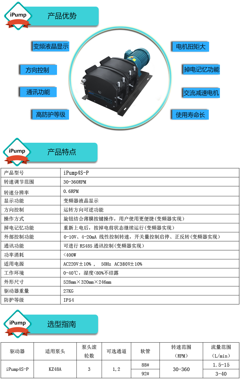 ? ? ?1.流量范圍:1.5-40L/min ? ? ?2.彈性壓管結構,軟管壽命長,非常適合大流量液體傳輸 ? ? ?3.免維護交流減速電機驅動,變頻器調節轉速 ? ? ?4.全金屬泵頭,高精度,更可靠 ? ? ?5.高防護等級,更適合惡劣環境中使用