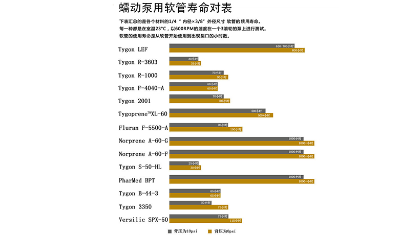 蠕動泵用軟管壽命對表