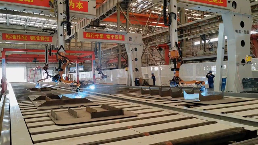 智能物流系統:配置智能RGV與桁車組成地面物流網絡,實現筋板、肋板與底板的自動化輸送;采用力感伸縮仿手翻板機完成大尺寸底板的安全高效翻轉。